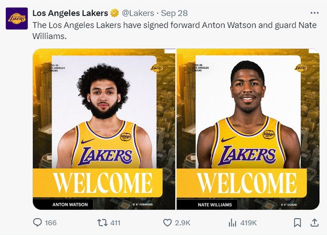 两天之前,湖人队用训练营合同分别签下了安通-沃特森和内特-威廉姆斯,湖人队终于完成了21人训练营名单的建立。